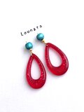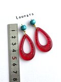 ウッドビーズピアス ターコイズブルー レッドアクリルチャーム 大ぶりピアス 樹脂ピアス
