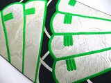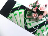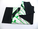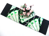 ■新品の帯をリメイクしました。黒地扇文様です。黒地には織により紐も描かれ銀糸と緑の扇文様です。