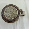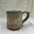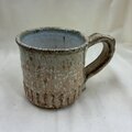常滑おぼろ土にチタン釉薬をかけ、還元焼成です。焼きによる釉薬の変化が面白い作品になりました。内側は白化粧をしています。日本茶もハンドルが付いたカップをお使いになる方も多いようです。