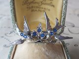 ヴィンテージ 2羽のツバメ と カエデ/ライトサファイアRhineストーン ブローチ