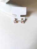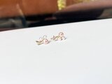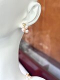 優しい光沢を放つ淡いピンクの天然淡水パールを中心に、両側に白い貝パールをあしらった可愛らしい3粒デザイン。小さなゴールドの枝にはキラリと輝くキュービックジルコニアを添えて、さりげなく耳元にきらめきを添えます。