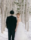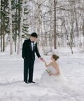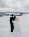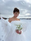 実例写真!ウェディングドレス ベアトップ 姫袖 リボン 柔らかく重ねたチュールスカート 可愛い 前撮り
