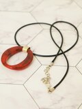 ゴールドチェーンにはせず、あえて黒の革紐タイプのチェーンにすることで、アクセントがつきとてもデザイン性の高いネックレスになっております。