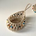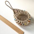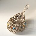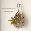 色彩豊かな天然石ビーズをマクラメに編み込んで作られた、コロンとした小さなしずく型のハンギングポットです。