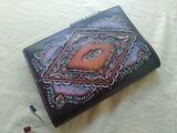 白革に刻印を配列し、拭き染めという技法で自家染色しました。
