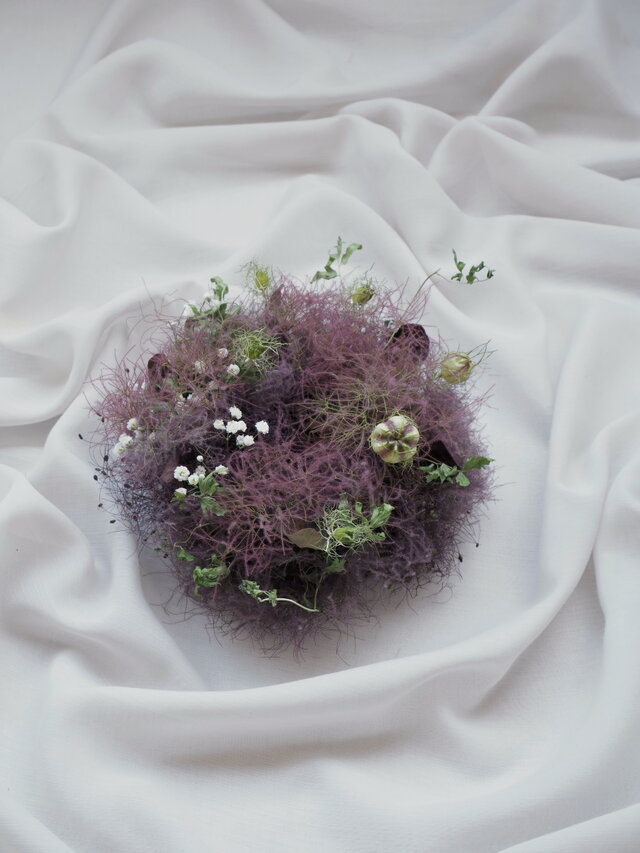 瀬戸内で育った ふわふわのスモークツリーを空気を含ませて丁寧に紡ぎ、コロンとして可愛らしいミニリースに仕立てました。