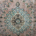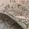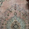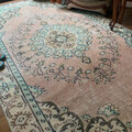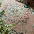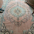 ダスティローズピンク(くすみピンク)を基調に、美しく咲き誇る大輪のフラワーメダリオンが印象的な特大サイズのヴィンテージラグ