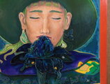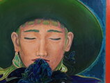 人物の帽子のクラウン部分はロマネスク時代の建造物ピサの斜塔が見えます。背景なのか帽子そのものなのか?本作品については世界観を語るより、見る人が自由に自身の世界として想像していただければと思います。