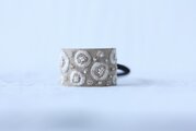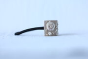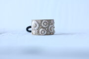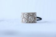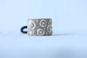 合金の土台のヘアゴムに、刺繍した布を頑丈に貼り付けてありますが、ビーズなども付いている為、取り扱いにはご注意下さい。