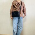 スペイン製メッシュレザーとタンニンなめしのイタリアンレザーで作った長財布もすっぽりはいるショルダーバッグです。
