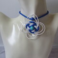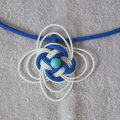 藍色と白の江戸打ち紐で花の形に飾り結びをしました。組み方は少しアレンジしています。