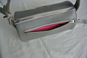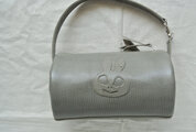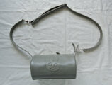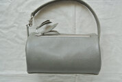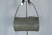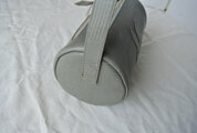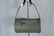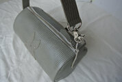 渋いグレーのリザードの型押しの革で作った丸い筒型のショルダーバックです。