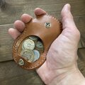 *植物タンニンなめしのロウ引き革(キャメルカラー)を白いロウ引き糸で仕上げており蓋のボタン部分を立ててもらうとコインの受け皿になります。