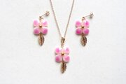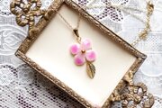 樹脂粘土で陶器風の艶やかなピンク色の紫陽花を作り、葉っぱチャームをあしらった可憐なペンダント。