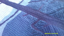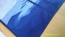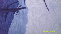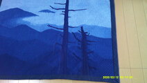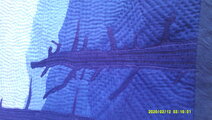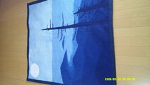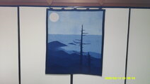 藍染の風景画の生地をもとに、裏にキルト芯を挟んで、キルティングと刺繍で作ったタペストリーです。