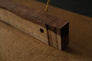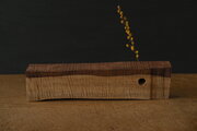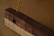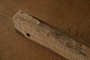 このローズウッド(A)は、大きめのドリルの穴が製作の空気を残しています。この穴に対して垂直にドライフラワー用の小さな穴を空けてあります。最後の写真では長めの針金を入れてみていますが、小さな穴は、大きな穴を跨いで下にもつながっています。底部分は残してあるので、貫通はしていません。