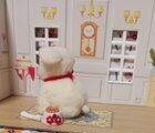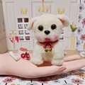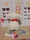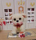 手のひらサイズの白い羊毛フェルト犬、鈴付きの首輪とエサ付き。