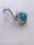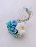 ブルーの薔薇とブルースターを使用し、アレンンジの中やシューズの周りにはリボンの装飾をしました。金色の流れるようにつけたリボンの上にお花のストーンを沢山つけています。
