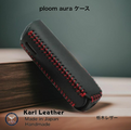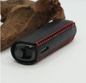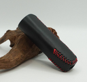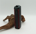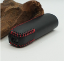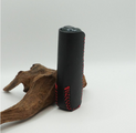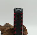 手作りの黒いレザーケース、赤いステッチが特徴で、電子タバコに最適。