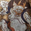 桐生織物は1300年以上の歴史を持ち、桐生織は江戸時代には幕府への献上品としても重用された格式高い織物です。複雑な文様や多色使いを繊細かつ立体的に表現できるその技術力は、国内外から高く評価されています。本作品においても、金糸銀糸をふんだんに織り交ぜながら、風神・雷神の筋肉の躍動や衣の流れ、背景の気流の動きに至るまで、筆致のようなニュアンスを織で細やかに表現しています。