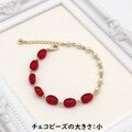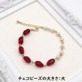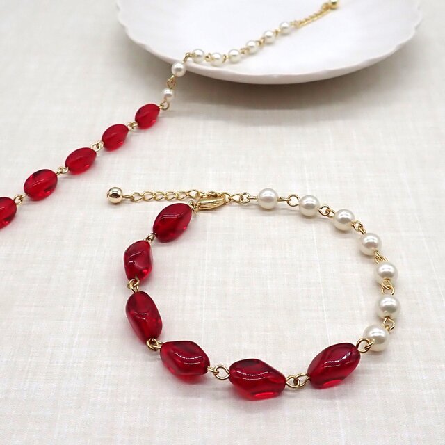 ツイストした形のレッドのチェコビーズとパールのバイカラーブレスレットです。