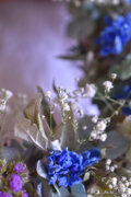 プチヴェールという小さなかすみ草やブルーの紫陽花、デルフィニュウムたち。ホワイトとブルーが溶け合うようなアレンジです。
