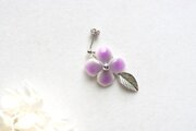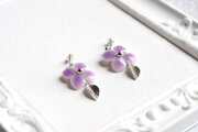 樹脂粘土で陶器風の淑やかな紫色の紫陽花を作り、葉っぱチャームをあしらった可憐なピアス。