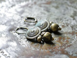 魔法陣の様なoldアフガンメタルパーツと2種類の民族鈴の様なパーツ繋いだピアスです。