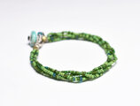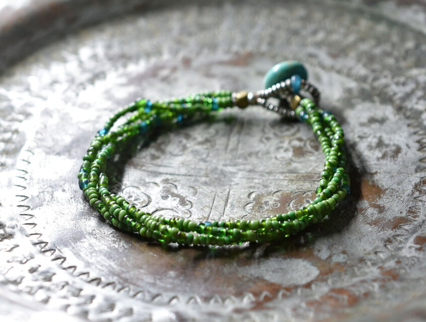 アンティークグリーンミックスシードビーズの4連ブレス(ターコイズ留め金)
