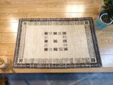 アイボリーにベージュが織り込まれ、 ライトブラウンで細かいラインが描かれ、 外枠はグレーで囲み、 中央と四隅には、四角が描かれています。 異国情緒な雰囲気を持ち、天然素材の家具やインテリア、 またグレイッシュなモダンなお部屋にも合うと思います。