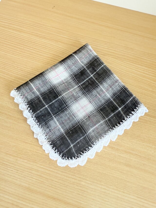 ダブルガーゼを2枚合わせにし、レース編みでふちどりをしました。