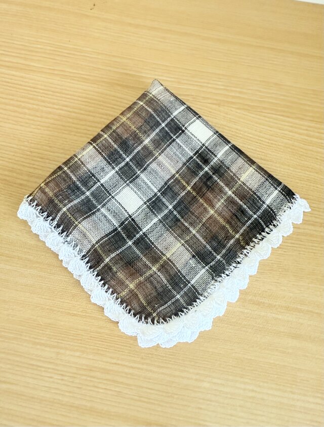 ダブルガーゼを2枚合わせにし、レース編みでふちどりをしました。