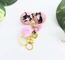 落ち着いた色合いのスモークピンク色の綿オックス地にお散歩姿の可愛いネコちゃん柄のマカロンポーチ付きキーリングです。