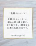 Elenaでは、その精神を大切にしながら、現代の素材を用いた簡易的な技法で制作しています。天然の本漆ではなく、扱いやすくかぶれにくい“新うるし”を使用し、金のような輝きをもつ“真鍮粉”で仕上げています。伝統の美意識を日常に取り入れやすくアレンジした、装身具としての「金継ぎ風アート」をお楽しみいただけたら嬉しいです。