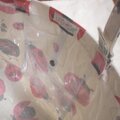 布地を透明ビニールで挟み、ミシンで縫い上げたバッグ。
