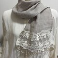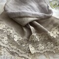 ハンドメイド◆生成りリネンリバーシブルラベンダーストールお花刺繍レースフリンジレースC&S リネンWガーゼチェック&ストライプ