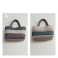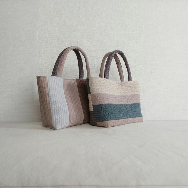 7mm幅のベージュ、ブラウン、グリーン系の韓国のヌビ生地(ラインキルティング)をランダムにパッチワークした、軽くて使いやすいシンプルな小さめトートバッグです。