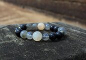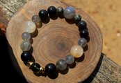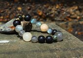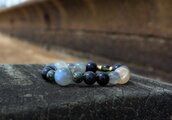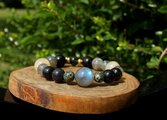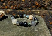 中心に13ミリのラブラドライト、潜在能力を引き出し、未来の知恵を伝えます。8ミリのプレセリブルーストーン、ロマンや神秘、啓示やメッセージという意味合いを持つ石です。10ミリのアグニマ二タイト、望みを叶える勇気を与えてくれる石です。10ミリのナチュラルラブラドライトAAA。13ミリのレインボームーンストーン、未来を予知する力を持ちます。12ミリのチンターマニストーン、古い概念やカルマからの解放を促します。最後に10ミリのモルダバイト、孤独や悲しみのトラウマを癒やすヒーリングストーンです。