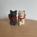 白土の猫と黒土の猫です。目やブチなど釉薬や色素で化粧しています。最高温度1230度で2度焼成。