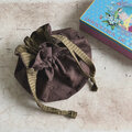 大切にしまっておいたいろいろなハギレを組み合わせて作った巾着袋、同じ組み合わせはありません。