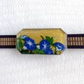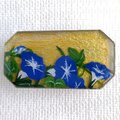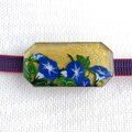明るい、ひまわりの花のような黄色(ウコン色)で地色を作り、青い朝顔が葉や蔓を延ばして成長していく様子を描きました。本来は縦にして見ていただく構図ですが、帯留めなので横にして描いています。横にすることで、地色が明るく華やかな印象になり、青い朝顔と緑色の葉をより引き立てています。