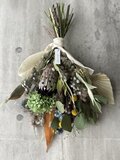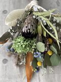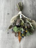大きめのスワッグ。サイズ約53×36㎝いい色のプロテアやスモークツリー、アジサイなど人気高い植物を束ねました。たっぷりのプリザーブドフラワーとドライフラワーを混ぜ合わせたお花です。なるべく長く維持するドライフラワーを厳選していますが、時間経過によりいずれはドライフラワーの方から先に退色していきます。光や日差しが当たらない涼しい屋内の場所ですと、いい状態を保ちやすいです。お花が過ごしやすい場所に飾ってあげるのもいいのですが、1番飾りたい場所で飾っていただくのもいいかもしれません。