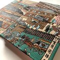 二代目歌川国輝による木版画「上刕(州)富岡製糸場」(明治五年九月刊行)を原画とし、その歴史的構図を織物の技術で精緻に再現した額絵を使用した作品です。原画は、明治政府が殖産興業政策の一環として設立した富岡製糸場の開業を記念し、近代日本の出発点を民衆に伝える目的で描かれました。煙突から立ち上る蒸気、整然とした煉瓦建築、活気に満ちた人々や馬車の往来には、文明開化の息吹とともに、技術革新への希望が溢れています。