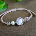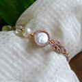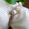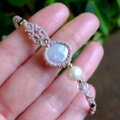 見る角度でキラリと輝き、ころっとした形が愛らしいコイン型のバロックパールとサイドには小粒ながらもまろやかな光沢が美しい淡水パールとカット水晶を合わせたアシンメトリデザインのマクラメ編みブレスレットです。