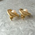 フェイクパールとゴールドトーンのクリップイヤリング。2種類のテクスチャーのロープが緩やかに交差して渦を巻くフレームデザイン。