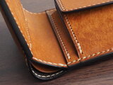 裁断から成形までの作業を全て手作業で行っています。縫い糸は台湾製の六花0.4ミリをロウ引きして使用、コバの処理はアルコール染料で染色後、磨き、蝋入れ、ヤスリがけを繰り返し、滑らかにした後に蜜蝋、コバワックスを熱で溶かしこみツヤ、耐久性を上げています。