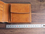 ご覧いただきありがとうございます。イタリアンレザーマルゴーを使用し、手縫いで仕上げた2つ折財布になります。色はフィエーノ(キャメル)を使用、一部にアメ豚ソフト(焦げ茶)を裏貼りしています。コインケースのマチ、札入れの仕切り以外は床面が見えにくい作りにしています。