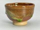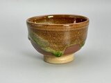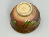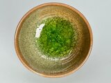 雑木灰を主原料とした釉薬を掛けています。中心に向かって透き通った黄緑の釉薬が深まり、貫入(かんにゅう)と呼ばれる釉薬表面の細かいヒビが複層して入り、光が乱反射してキラキラ輝いて見えます。見ても使っても楽しい盃です。