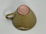 虫明伝統の天然松灰を基調とした灰釉を掛けたコーヒーカップ・ソーサーです。カップはシンプルで爽快なフォルムで、深みのある若草色で、正面には青白い乳濁調の釉薬がほどよく流れてアクセントが効いています。ソーサーも深みのある若草色で、コーヒーがおいしく感じる落ち着いた色合いと質感です。ANAクラウンプラザホテル岡山のフレンチコース料理とコラボレーションした時に採用された作品と同じデザインです。