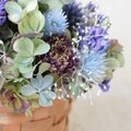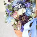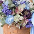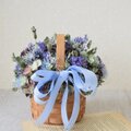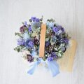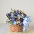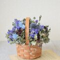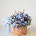 【小さ目の丸カゴで、ブルー系の花材が希望】とのオーダーでした。